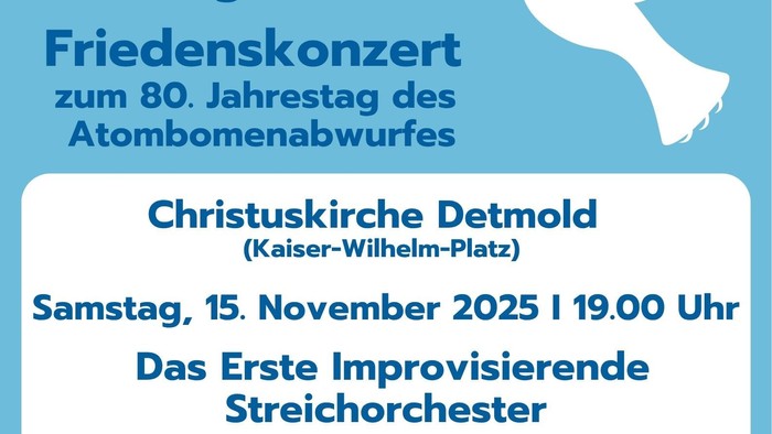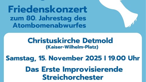 In diesem Jahr jähren sich die Atombombenabwürfe in Japan zum 80. Mal. Aus diesem Anlass spielt Das Erste Improvisierende Streichorchester am 15. November ein Friedenskonzert. Christoph Beyer begleitet die Musiker*innen mit einer Lesung. Die Musik und die Texte ermöglichen es den Besucher*innen, der Menschen in Hiroshima und Nagasaki würdevoll zu gedenken. Sie regen dazu an, die eigene Haltung zu Menschlichkeit und Frieden im Alltag zu stärken und zu leben.