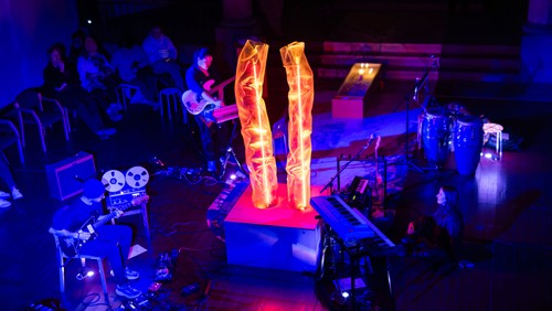 Die Indie/Alternative-Pop-Band YENGA und das Lichtkunst-Duo scheinzeitmenschen bringen Musik und Licht in einem Konzertabend zusammen. Die Musiker*innen treten gemeinsam mit der interaktiven Lichtskulptur Dunstglas auf. Die Skulptur, in der Neonlicht mal fließt, mal pulsiert, mal von Dunst umhüllt wird, reagiert mit Veränderungen des Lichts auf musikalische Impulse: Die Band spielt nicht nur ihre Instrumente, sondern damit zugleich auch das Licht, das den Raum in immer neue Atmosphären taucht. So gehen Licht und Klang eine faszinierende Symbiose ein, verschmelzen mit dem Spielort und laden das Publikum ein, im Licht-Klang-Raum zu versinken.
