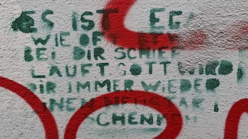 Eine grüne Schrift. Hoffnungsvoll. Sie droht vielleicht überlagert zu werden von roten, größeren Worten.