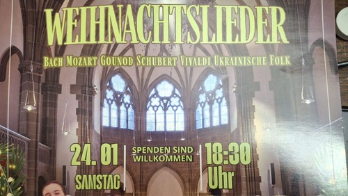 Das Kammerensemble lädt zum Ausklang der Weihnachtszeit zu einem Konzert mit Weihnachtsliedern ein. Neben Bach, Mozart, Gounod stehen Schubert, Vivvaldi und unkrainischer Folk auf dem Programm.