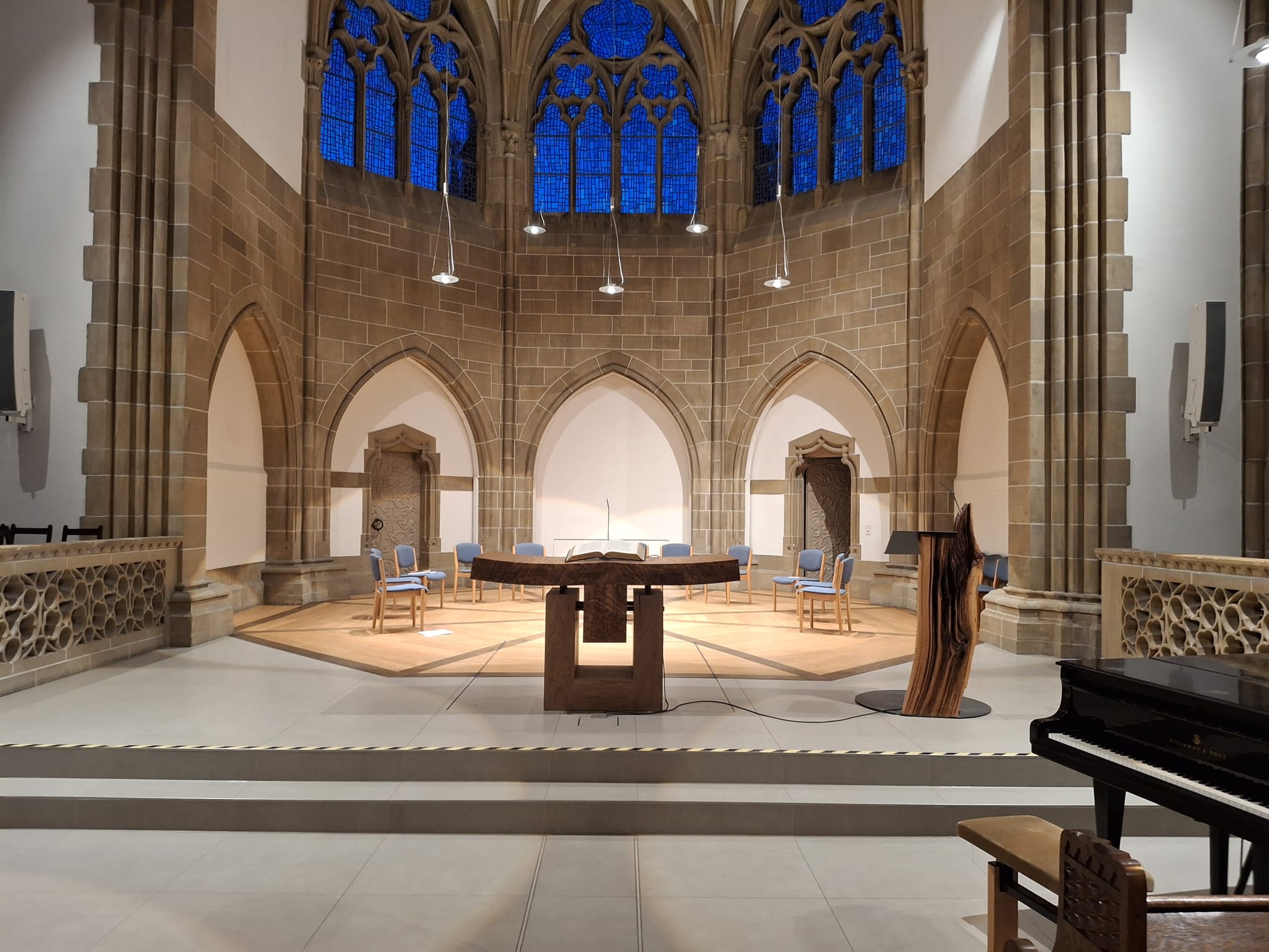 Eine umfangreiche Sanierung hat der Christuskirche ein neues Gesicht gegeben. Sie ist ein heller, offener Raum geworden und wir nutzen sie nicht nur als Kirche sondern als Gemeindezentrum . Manche Gäste wundern sich: Wir haben nicht nur Orgel, Flügel und Harmonum in der Kirche, sondern auch Küche, Kicker und Tischtennisplatte. In der Kirche findet sich auch das Pfarrbüro und einmal wöchentlich das Gemeindebüro. Mit der Taufkapelle verfügt die Kirche über einen weiteren Gruppenraum.